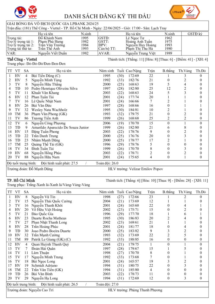 Danh sách đăng ký thi đấu CLB Thể Công Viettel vs CLB TP.HCM (vòng 26 VĐQG LPBank 2024/25)