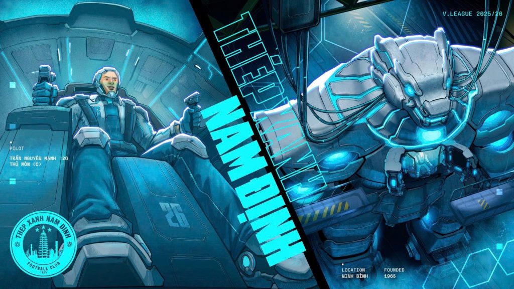 Thép Xanh Nam Định: Xuất hiện đầu tiên trong Promo của mùa giải là đội bóng đương kim vô địch – CLB Thép Xanh Nam Định với 2 lần liên tiếp lên ngôi ở giải đấu danh giá nhất Việt Nam (mùa giải 2023/24 và 2024/25)và hình ảnh Thủ môn Trần Nguyên Mạnh (26). Robot được mô tả như những người “bảo vệ chiếc cúp V.League” cùng sự khắc họa hình ảnh cặp Nghê đá đền Trần Nam Định, với trường năng lượng tạo hình từ họa tiết trên cửa đền Thiên Trường.