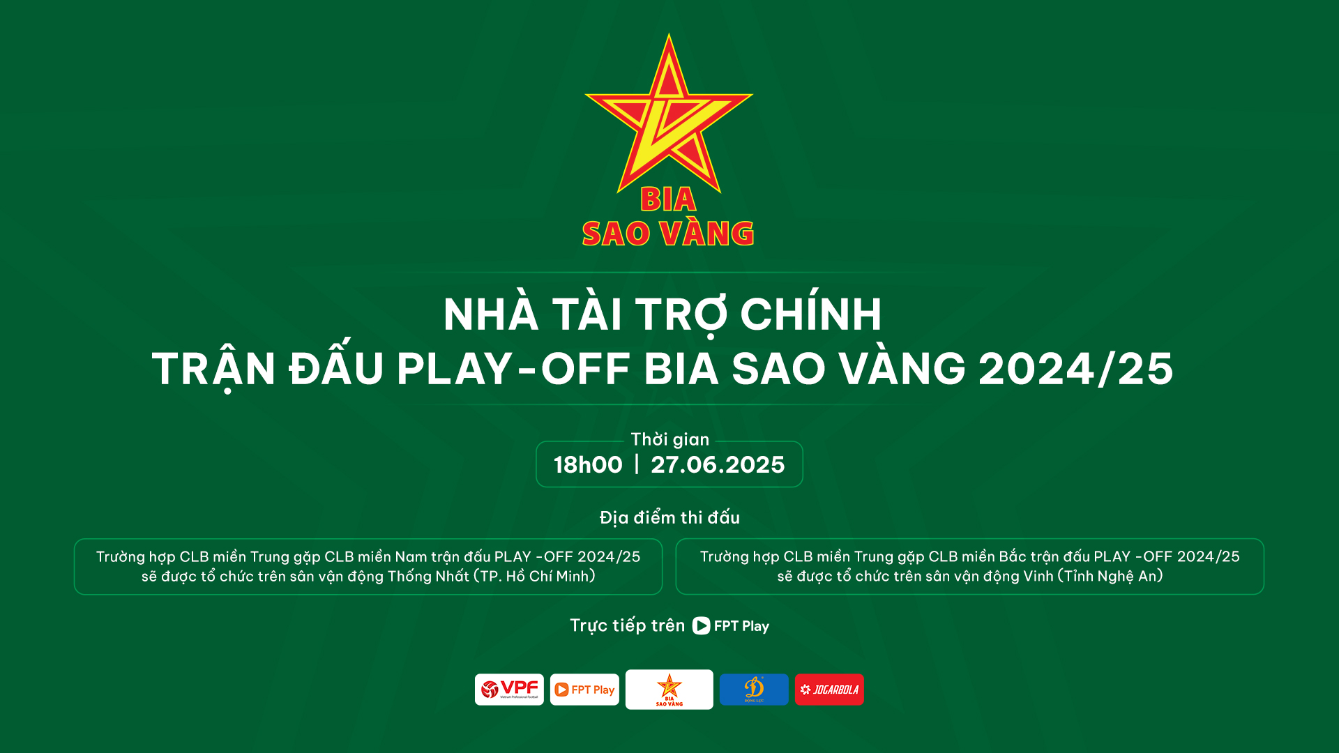 Cặp đấu chính thức góp mặt tại Trận đấu PLAY-OFF Bia Sao Vàng 2024/25 sẽ chỉ được xác định đến tận vòng đấu cuối cùng của cả Giải HNQG Bia Sao Vàng 2024/25 và VĐQG LPBank 2024/25. Trận đấu sẽ được được FPT Play tường thuật trực tiếp và trọn vẹn trên các hạ tầng của FPT Play.
