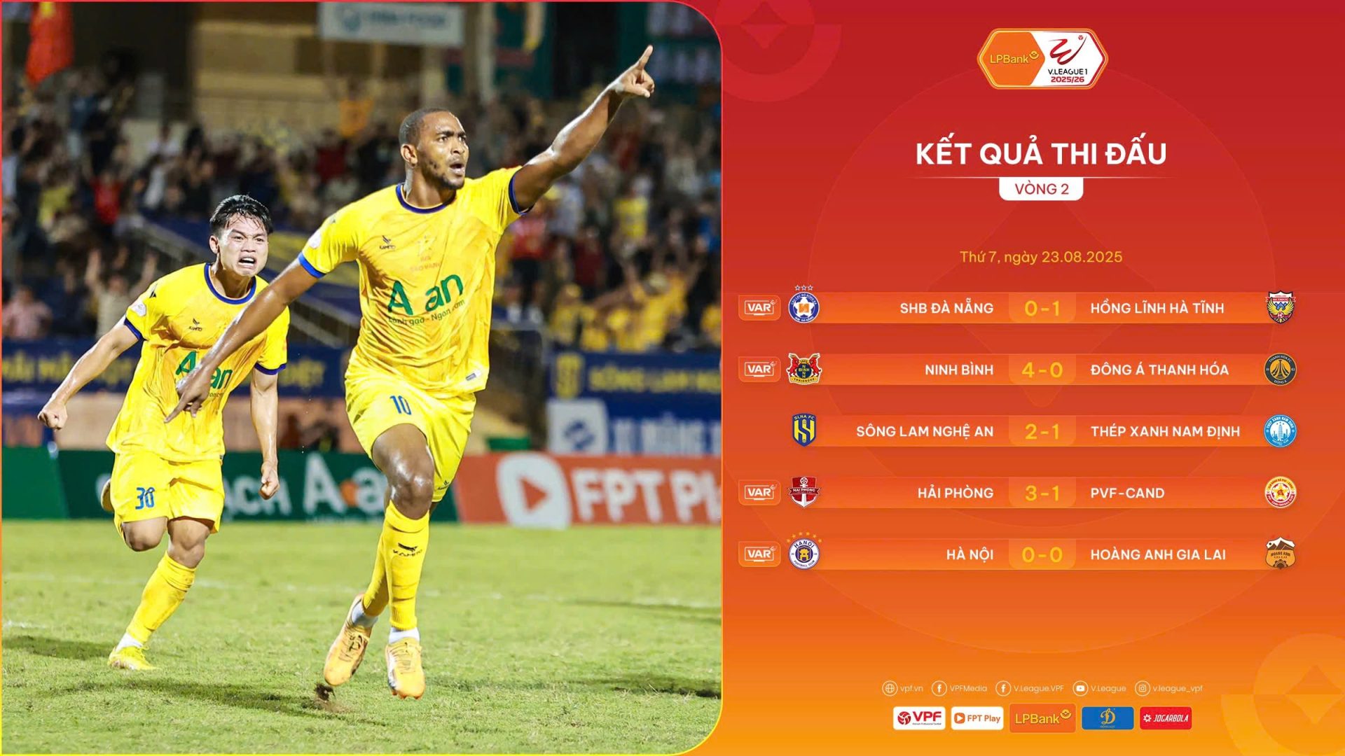 Bất ngờ nối tiếp bất ngờ tại vòng 2 LPBank V.League 1 trong loạt trận ngày 23/8. Bất ngờ lớn nhất chính là màn ngược dòng khó tin của CLB SLNA trước nhà ĐKVĐ Thép Xanh Nam Định trên sân Vinh. CLB TX Nam Định với binh hùng tướng mạnh sớm có bàn thắng ngay phút thứ 9 công Lâm Ti Phông, tưởng chừng mở ra trận thắng tiếp theo. Tuy nhiên, các cầu thủ đội chủ nhà đã lật ngược tình thế trước “người khổng lồ”. Khởi đầu là Văn Lương gỡ hòa phút 41, và tiếp nối là Reon Dale Moore nâng tỉ số lên 2-1 phút 81.