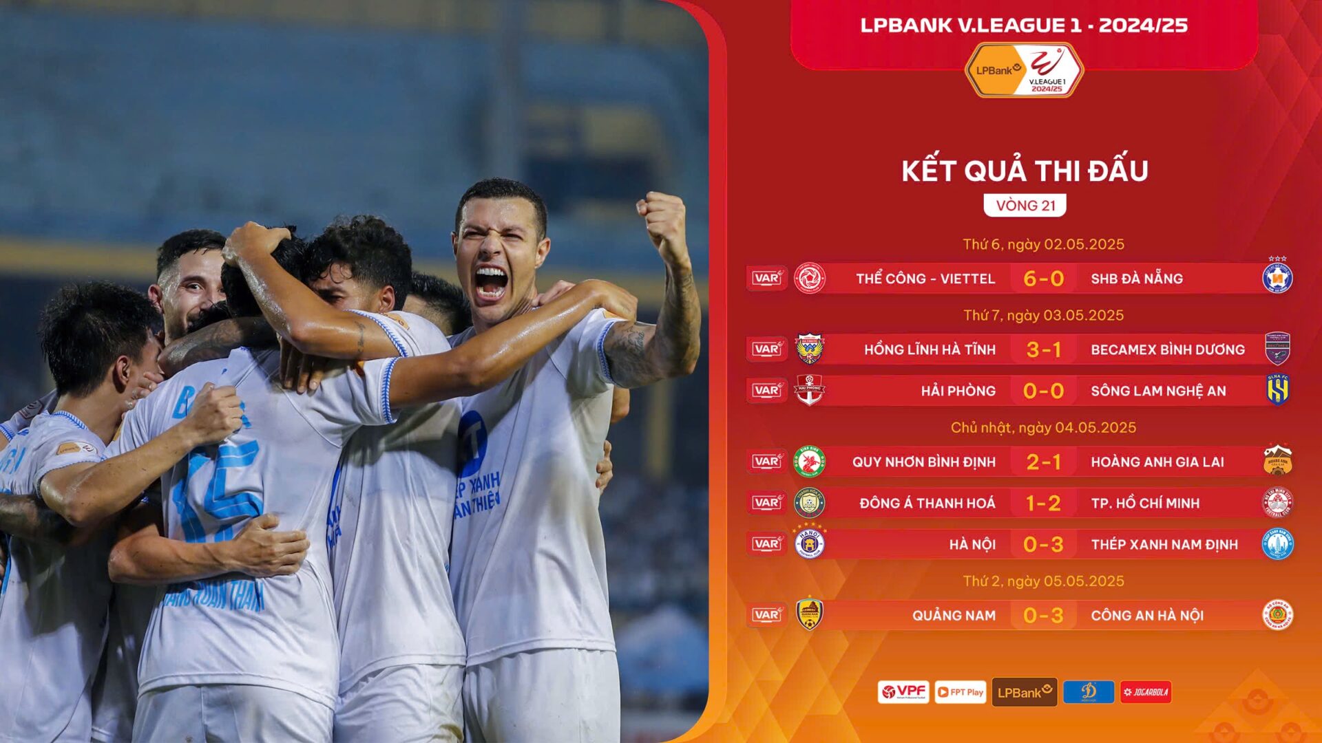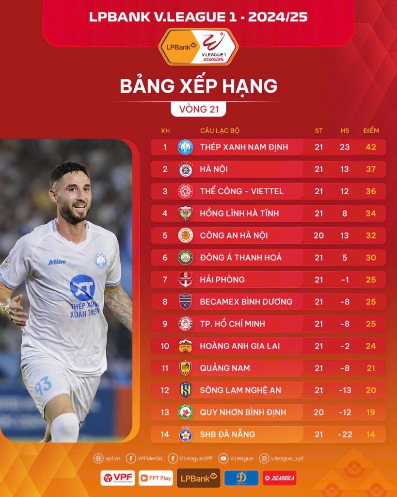 Bảng xếp hạng sau vòng 21 LPBank V.League 1-2024/25: