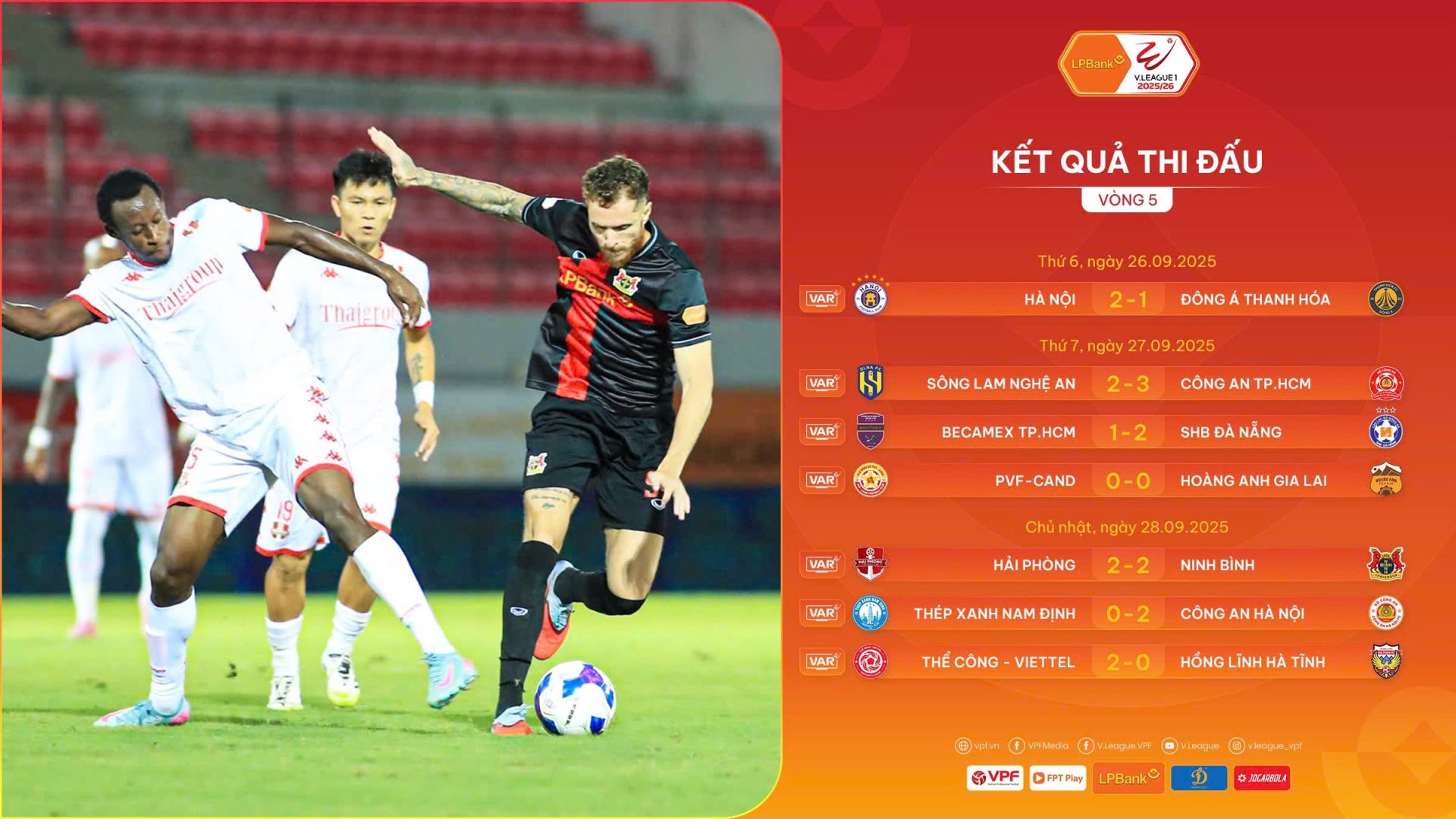 Tâm điểm của vòng 5 LPBank V.League 1-2025/26 là cuộc đối đầu giữa ĐKVĐ Thép Xanh Nam Định và Công an Hà Nội trên sân Thiên Trường. Một lần nữa tiền đạo Leo Artur lại cho thấy cái duyên ghi bàn của mình ở đây và vẫn với cùng một kịch bản là xuất phát từ một pha phối hợp ăn ý với người đồng đội Alan Grafite. Sang hiệp 2, chính Alan là người đóng đinh trận đấu với bàn thắng ấn định tỷ số 2-0 sau pha kiến tạo của Quang Hải, giúp Công an Hà Nội củng cố vị trí của mình ở nhóm đầu của bảng tổng sắp.