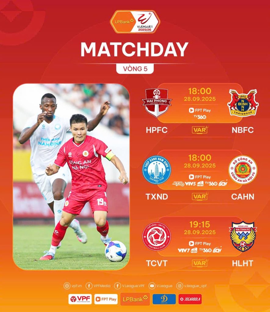 Các trận đấu vòng 5 LPBank V.League 1-2025/26 diễn ra chiều nay (28/9):